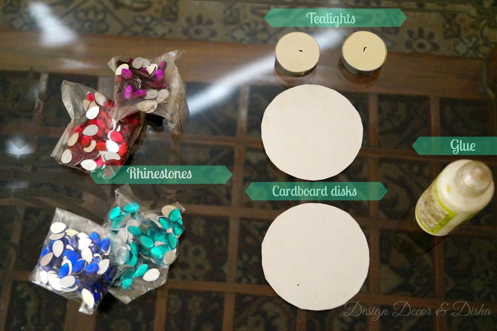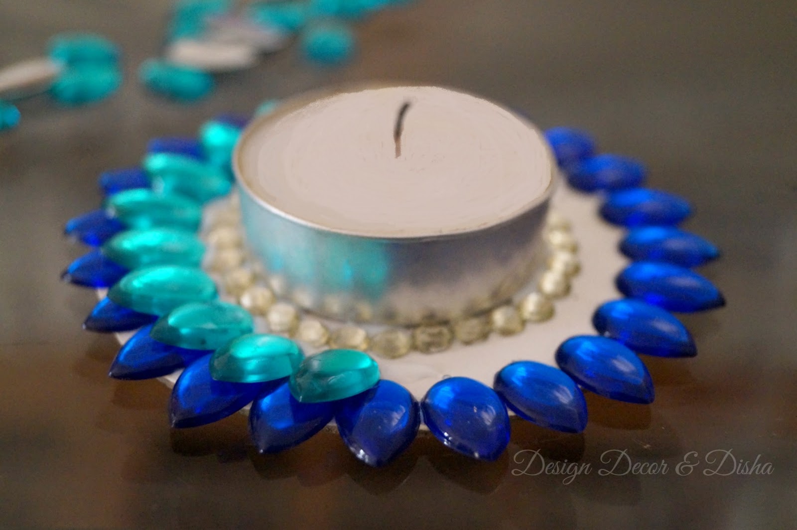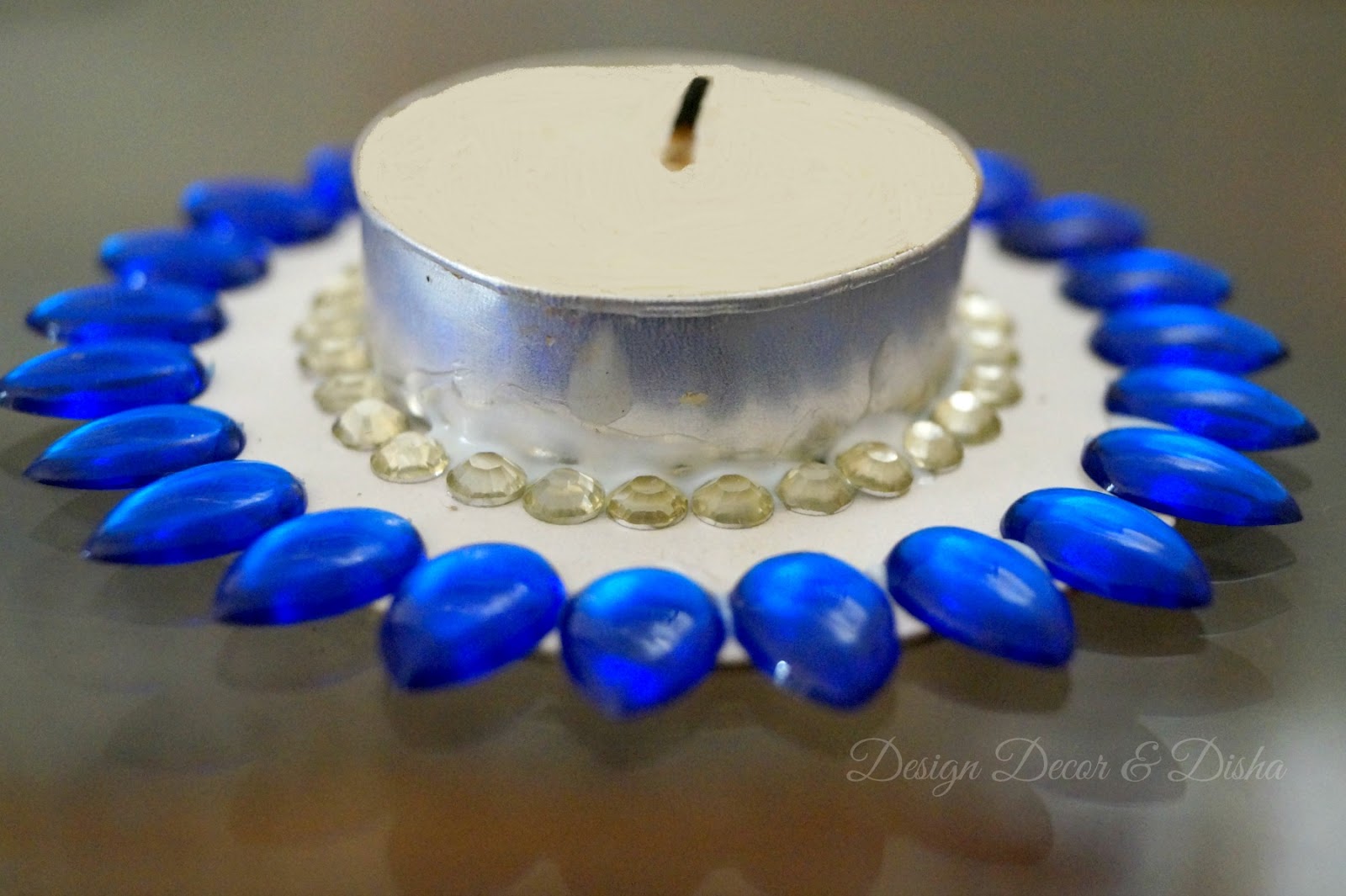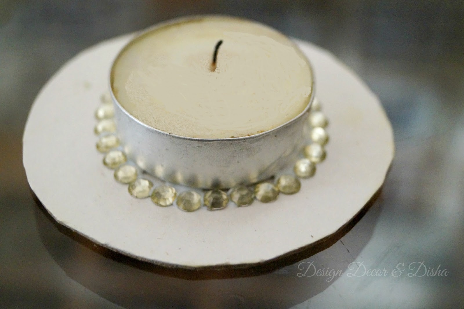 Once it is dried start sticking round acrylic rhinestones in the lightest shade like white or pale white around the base of the tealight.