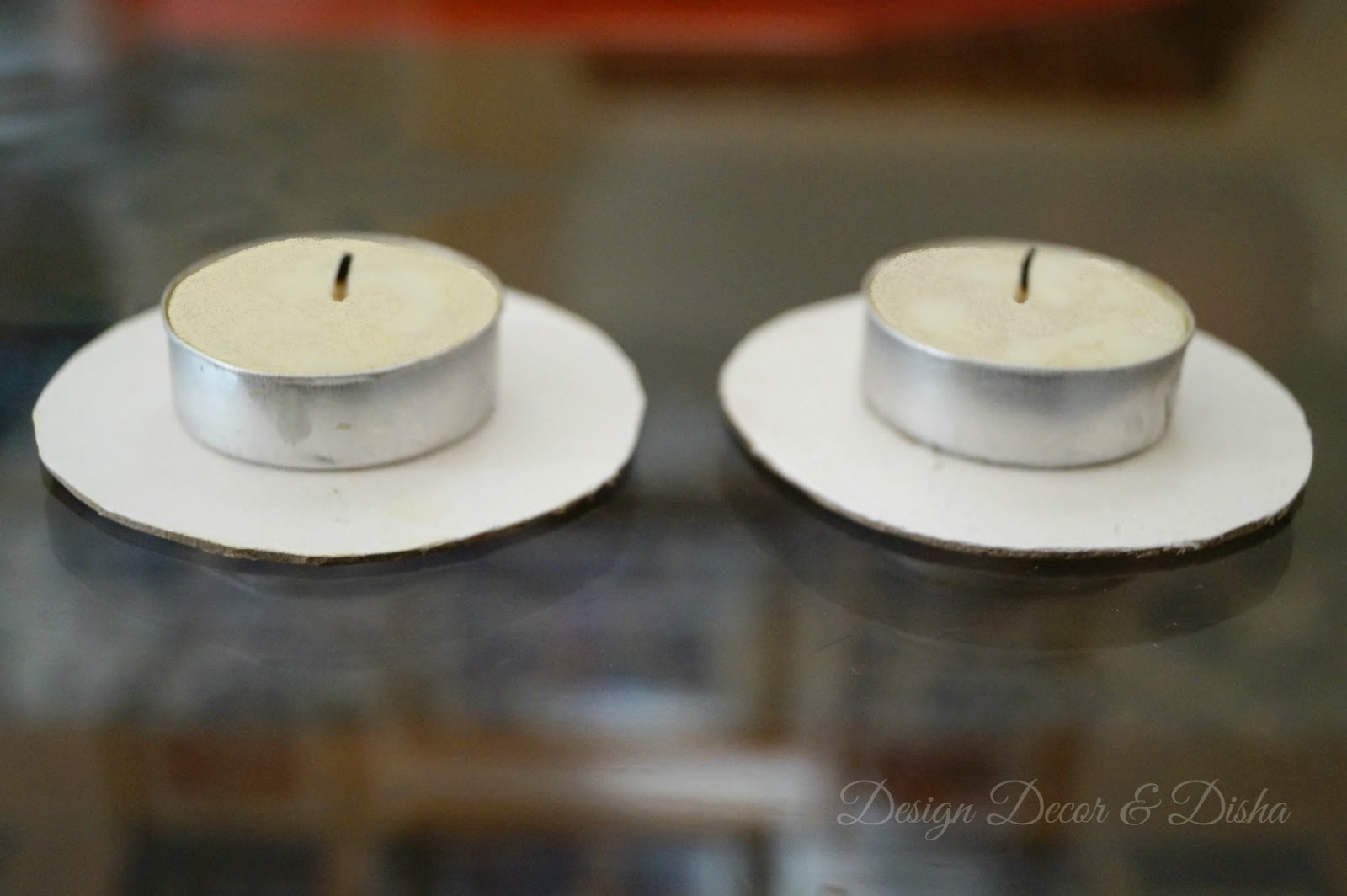 First cut cardboard circles (as many circles as you want to make lotus tealights). The size of the circle should be 3 inches larger than tealight. Now apply some glue at the base of tealight and stick it in the centre of the cardboard circle.