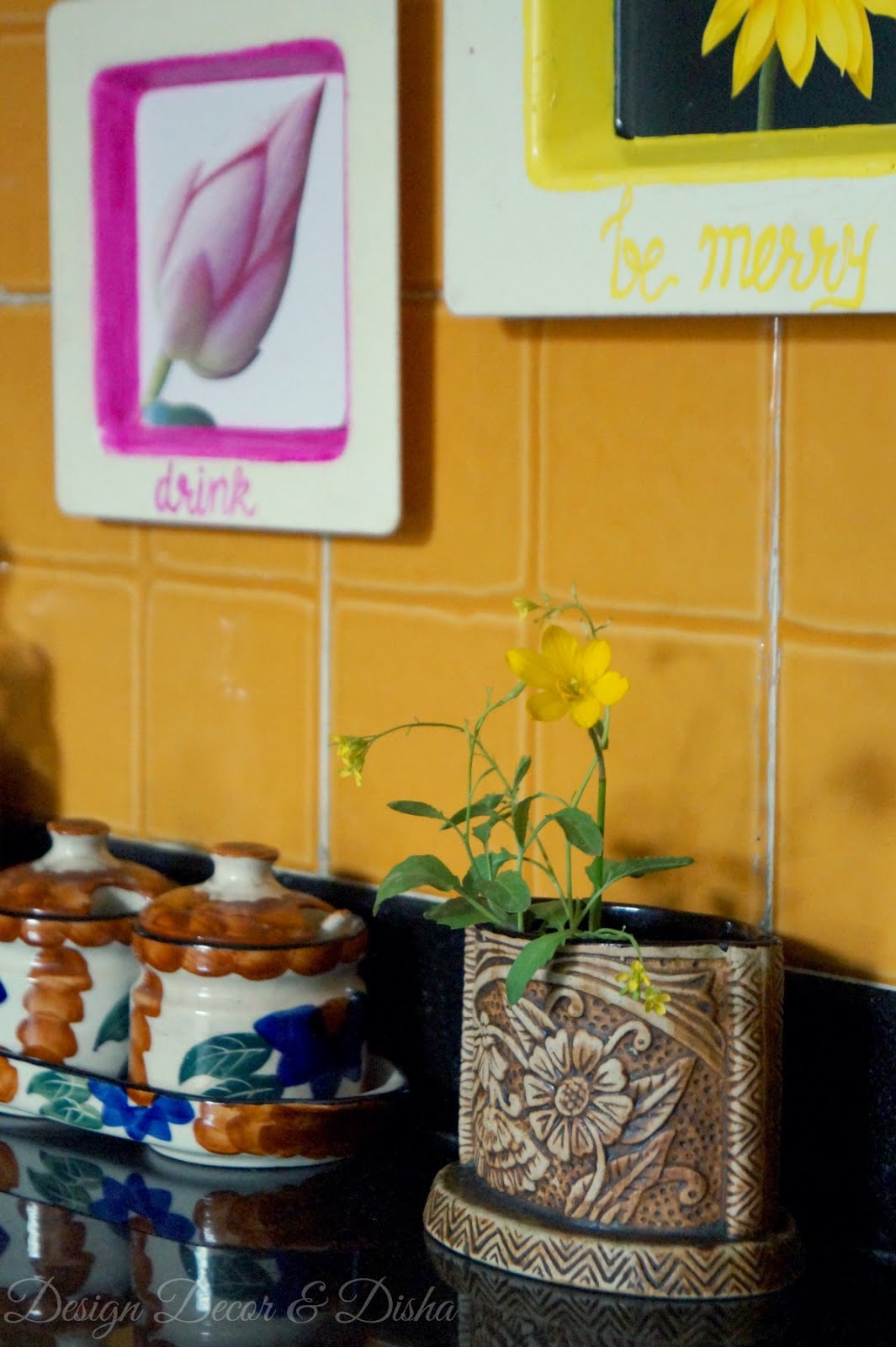 Blue, pink & yellow on orange backsplash aren’t creating a cohesive look and I think this is the reason why I am not finding it to my liking. But I wouldn’t mind looking at those bright colours and cheerful blooms every day while I cook for my family.