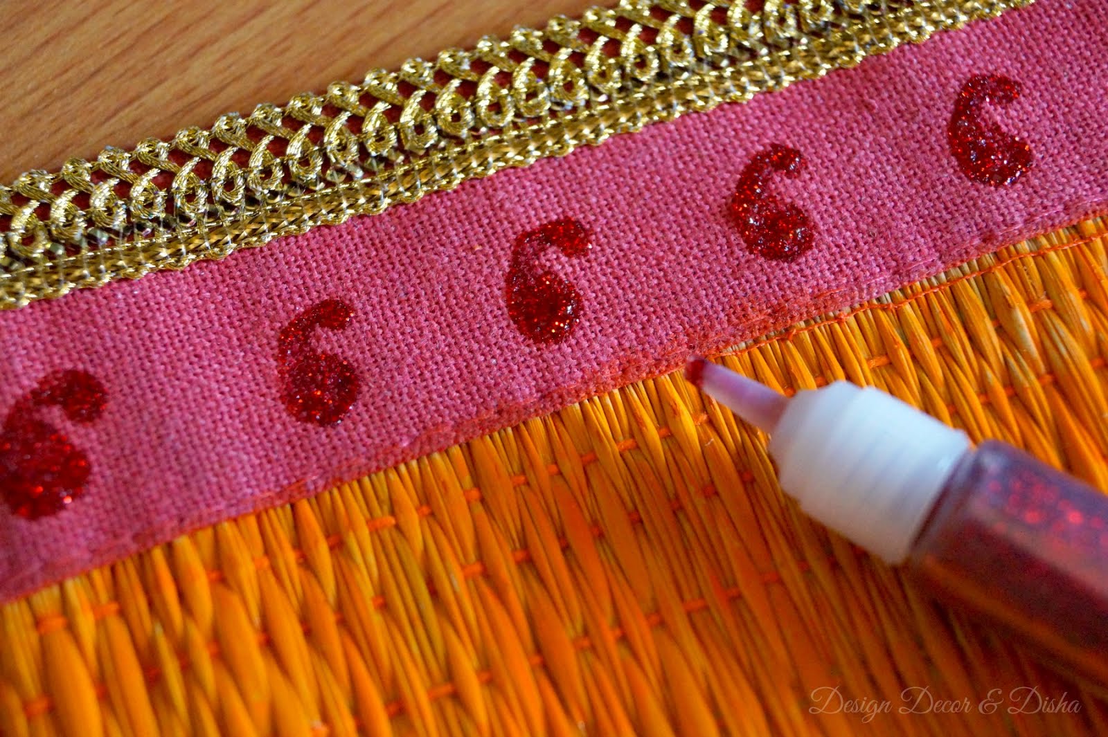 After adding lace I wanted to add more bling to the placemats so using glitters I drew a paisley pattern on the border.