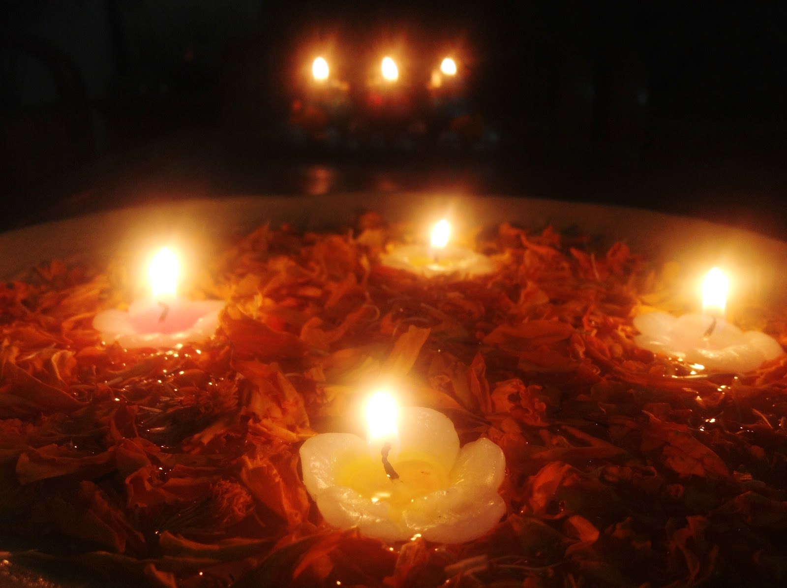 Floating candles and petals spreading festive magic.