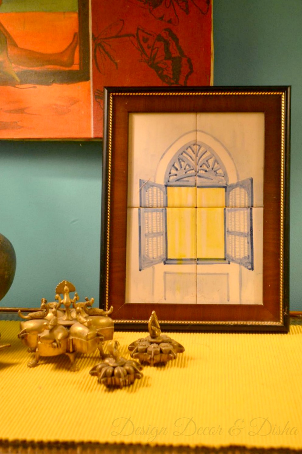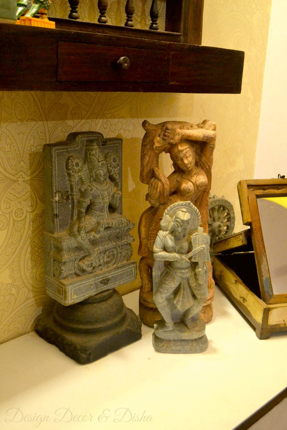 Preethi is a pro when it comes to decorating with different elements. She puts together wood, brass, and stone in the most beautiful way that is pleasing to the eye. The wooden mirror as seen in the below image works as a statement piece, Brass diyas in varied heights are clubbed together and stone sculptures add the old world charm.