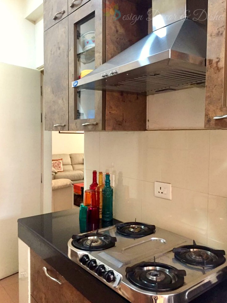 Next to this is Rashmi’s neat and clean kitchen. She loves clean edges. Functionality plays a major role in this space. Tinted glass bottles add a splash of color to make the space more interesting.