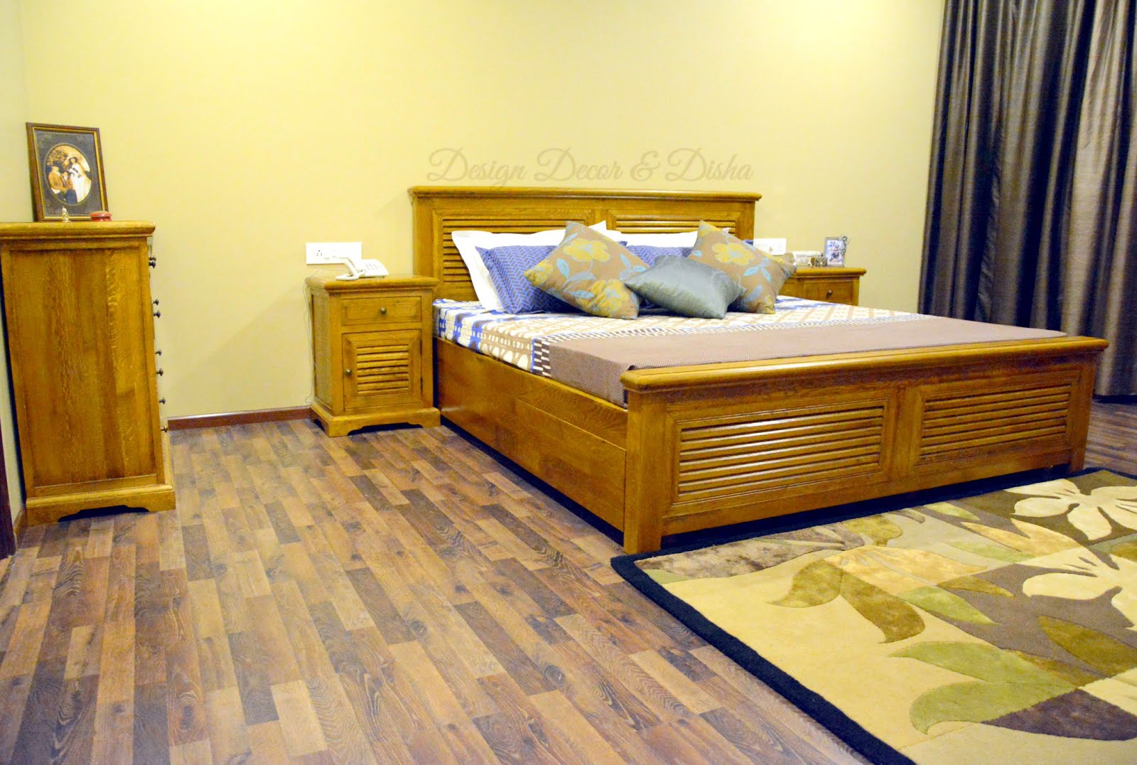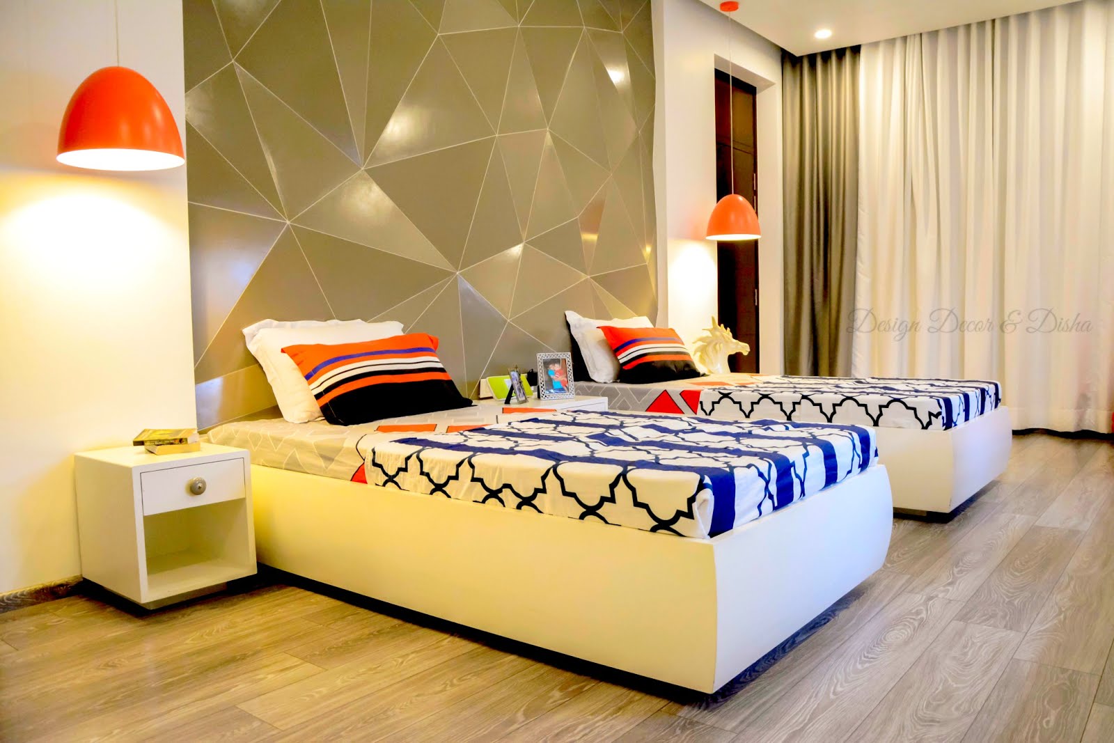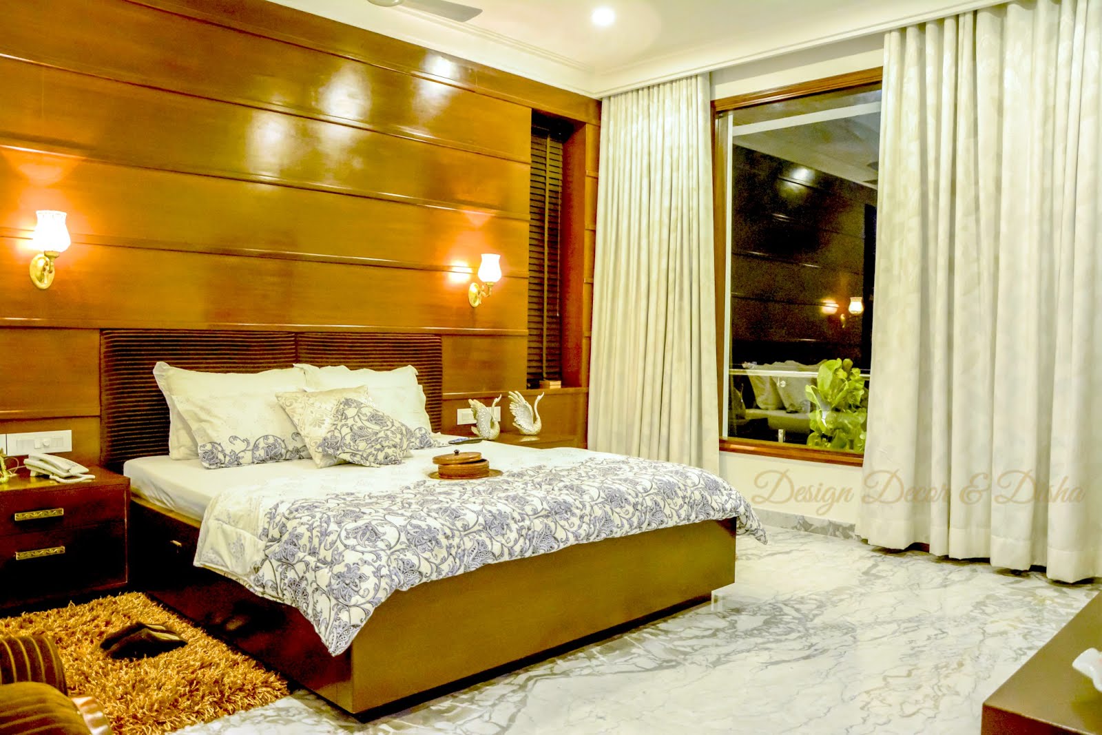 The grandparents’ bedroom is designed with glimpses of the contemporary feel, with Statuario used on the flooring and wooden panelling done on one of the walls.