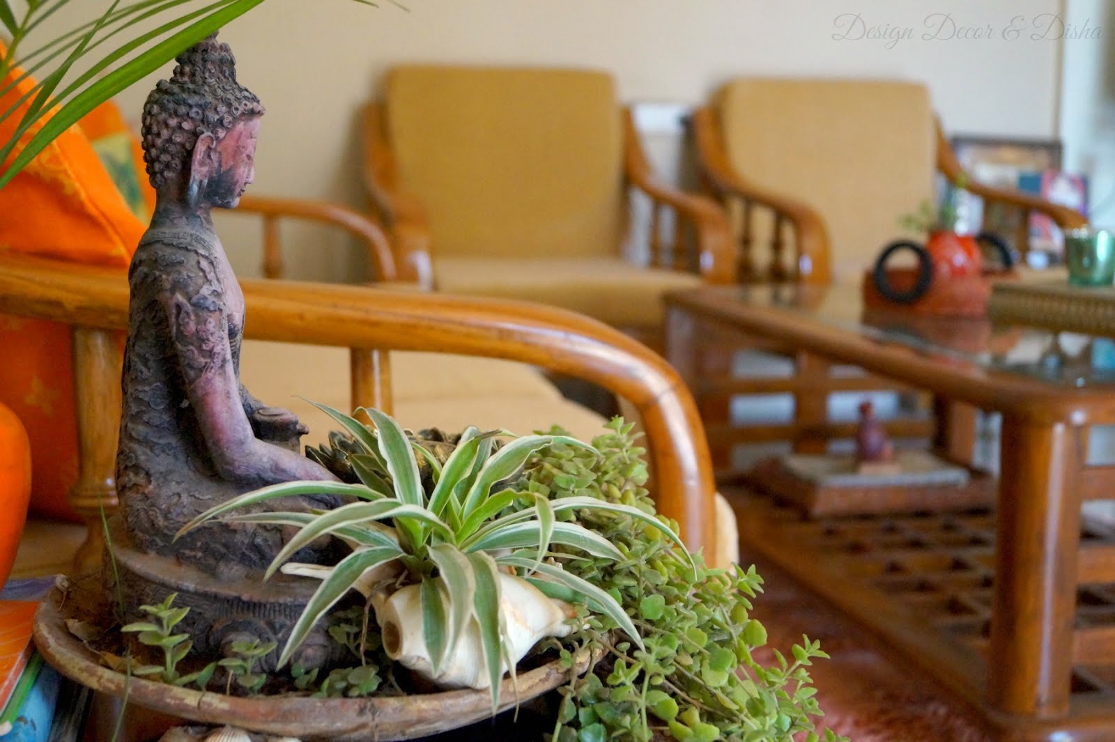 Don’t forget to style the coffee table and side table. I placed green votives and a brass trinket box at the one end of the coffee table and a red Anthropologie inspired planter in a sabai grass basket on the other end to balance the look. On the side table, I added lots of green to make the place look lively and placed Buddha figurine that exudes serenity. I placed an orange colour vase behind Buddha for a cohesive look as my cushions are orange too.